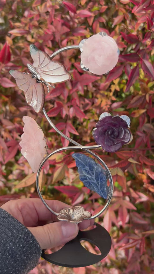 Rose Quartz, Ocean Jasper, Fluorite, Blue Aventurine Butterfly, Flower, and Leaf Carvings