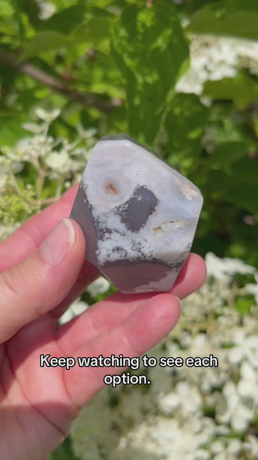 Rose and Quartz has a large selection of freeform crystals of varying sizes. Materials available include but are not limited to: Red Banded Agate, Black Agate, Moss Agate, Fire Quartz, Brazilian Agate, Golden Rutile, Orca Agate, Pink Amethyst, Sugar Amethyst, Peach Moonstone, Sunset Labradorite, Flower Agate, Lapus Lazuli, Blue Tiger Eye, and Indonesian Palm Root.