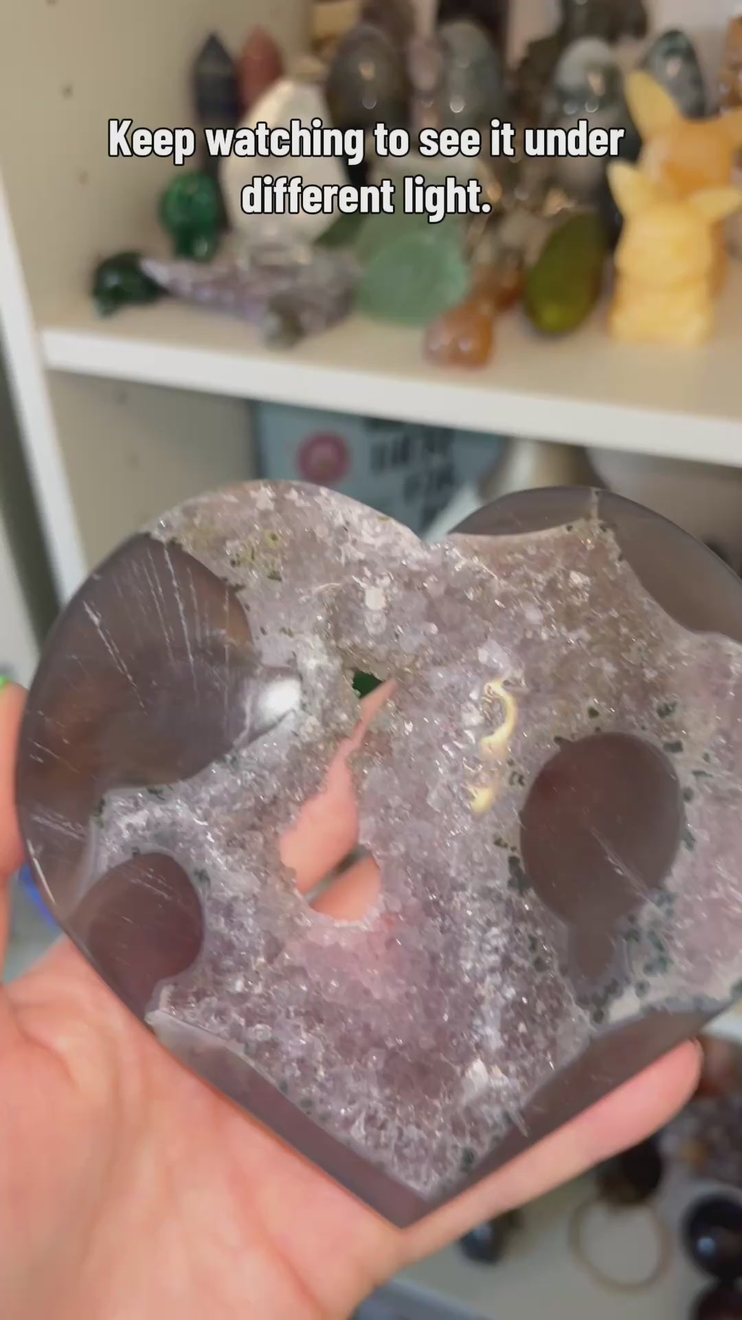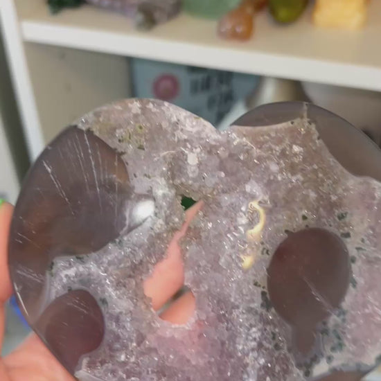 This absolutely incredible Amethyst x Agate x Quartz heart has such beautiful detail and sparkle within the druzy. It comes with a stand to display on it. Every purchase comes with a gift!