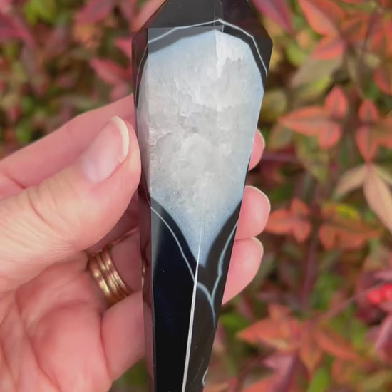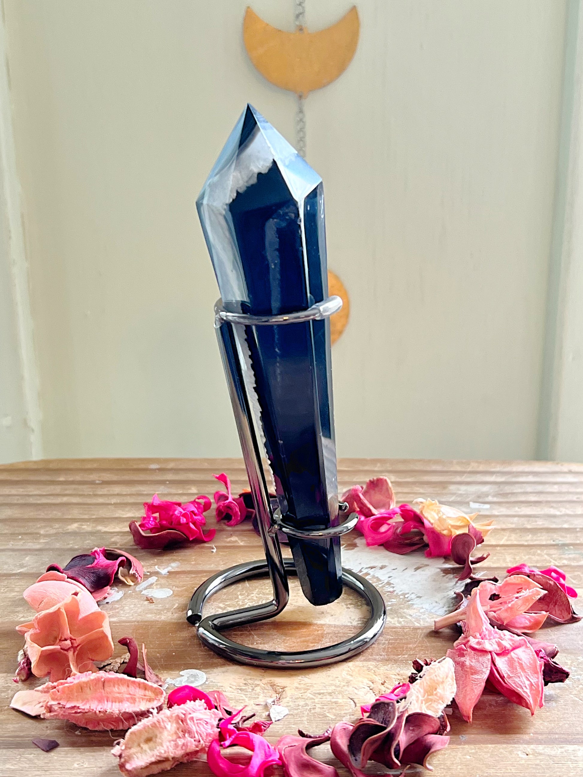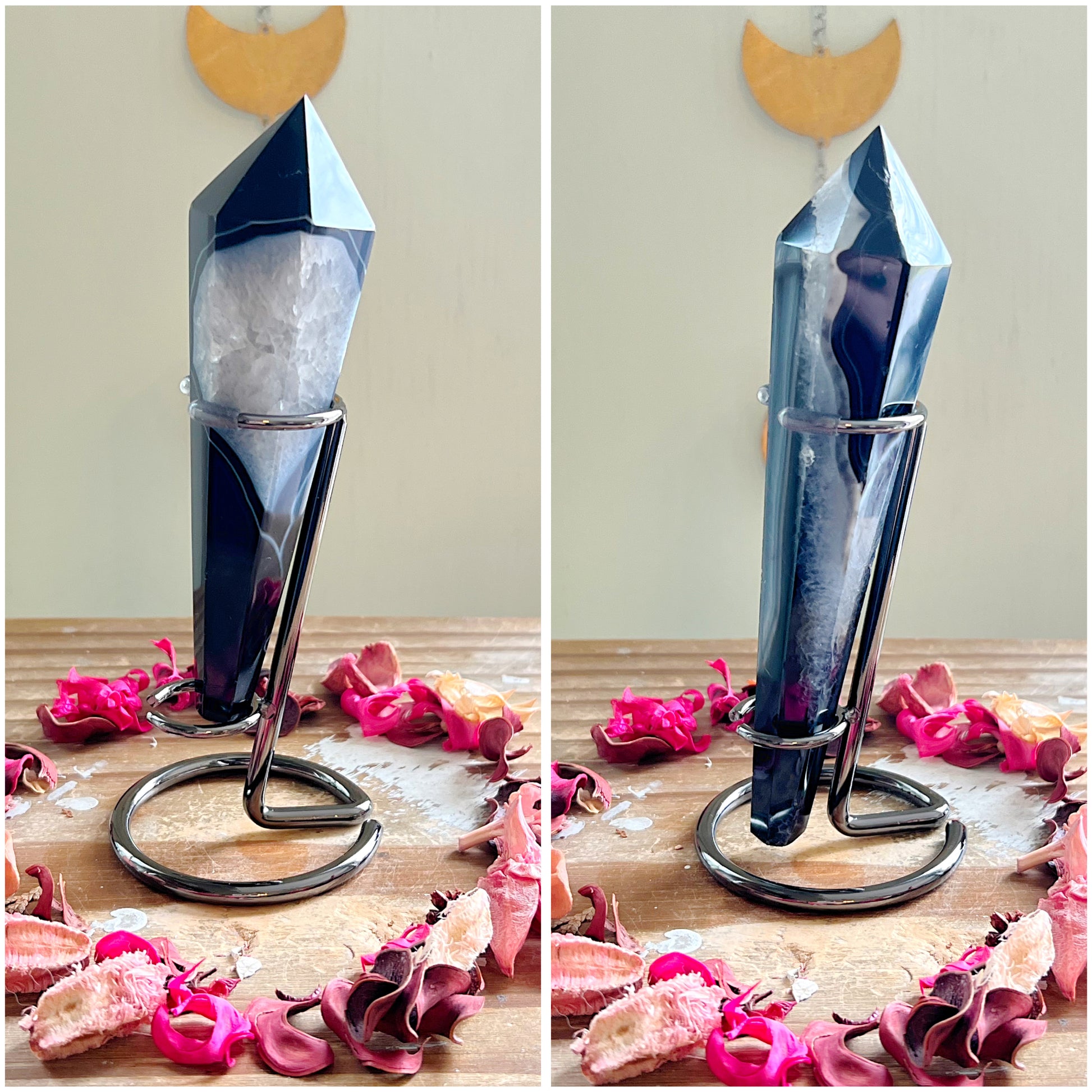 These gorgeous Black Agate wands are full of Quartz and have stunning designs. Each comes with a stand. Every purchase comes with a gift!