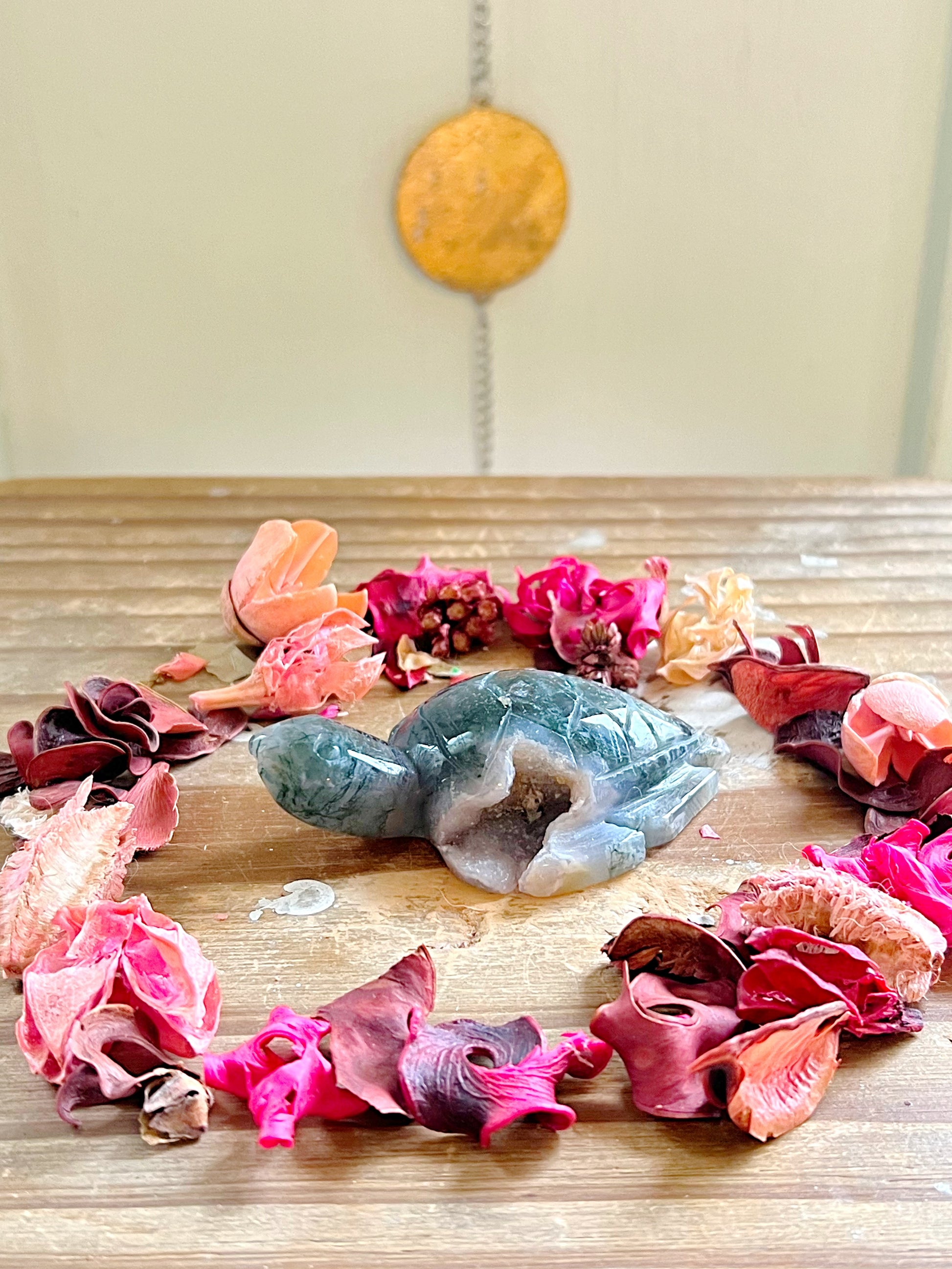 These stunning druzy Moss Agate sea turtles have the prettiest wispy moss and stunning sparkly druzy. Every purchase comes with a gift!