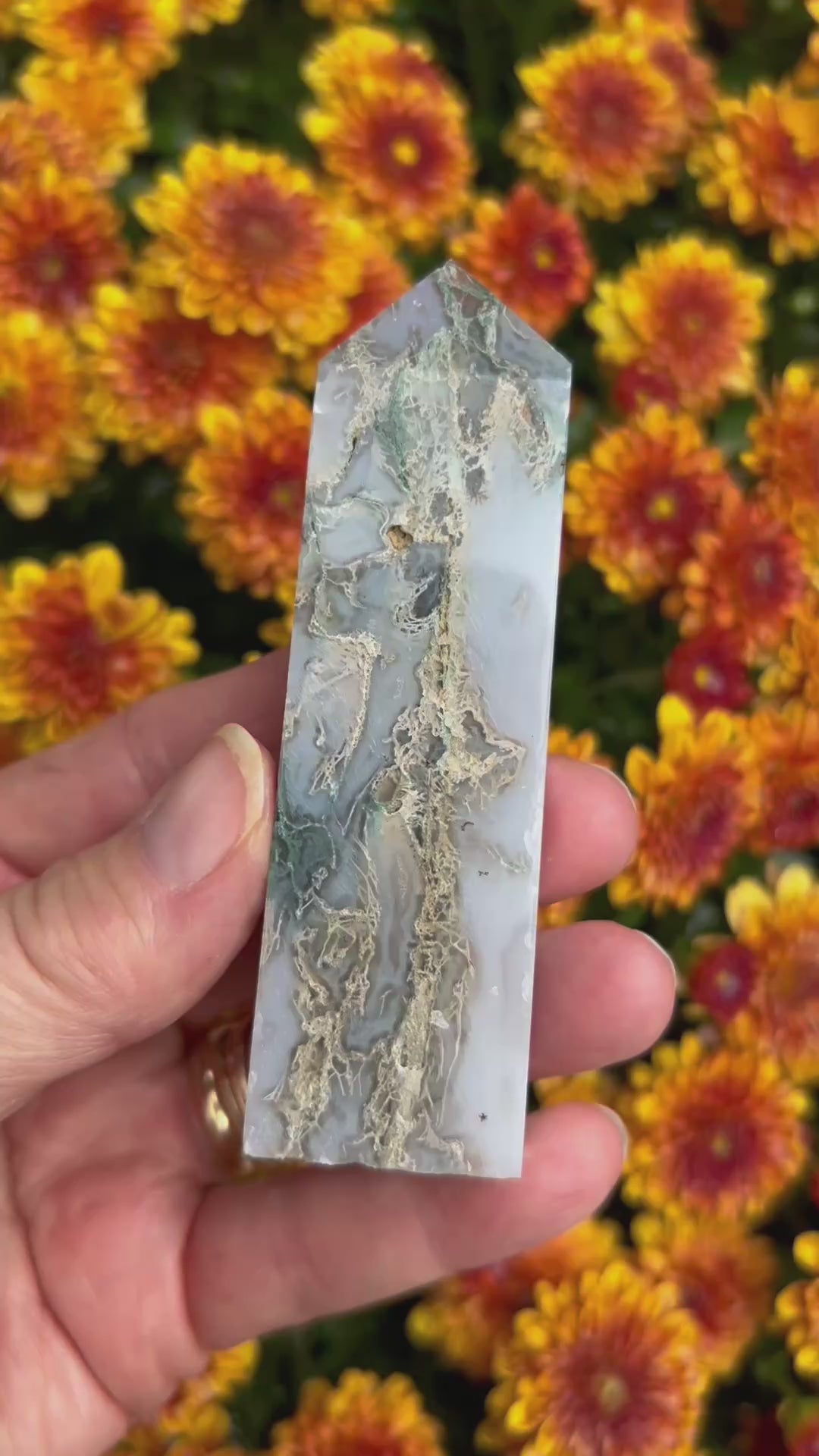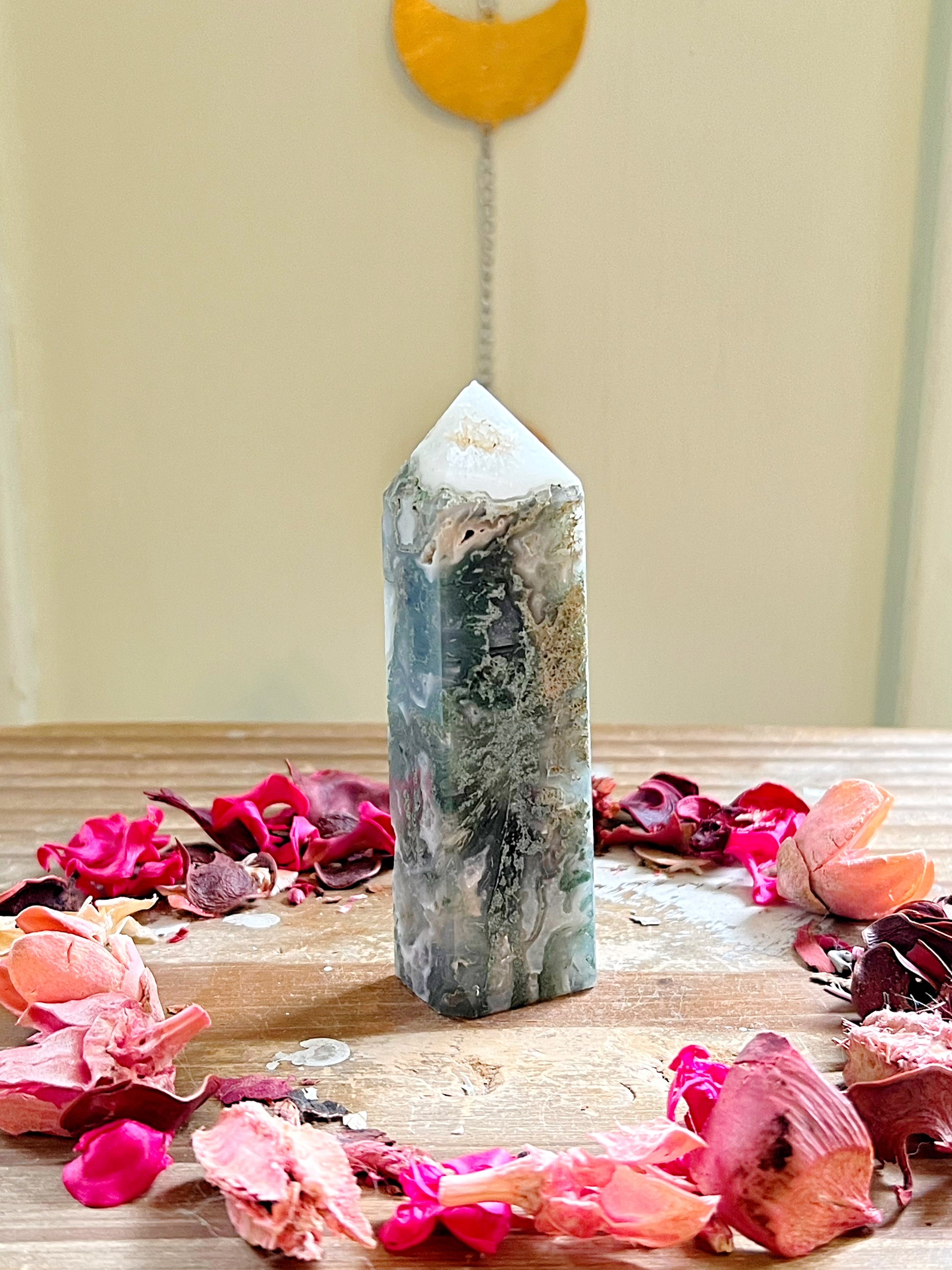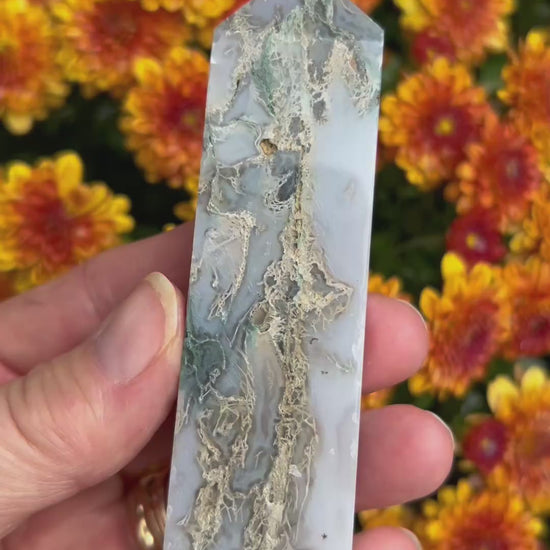 These stunning Moss Agate towers have the prettiest wispy moss and stunning druzy. Every purchase comes with a gift!