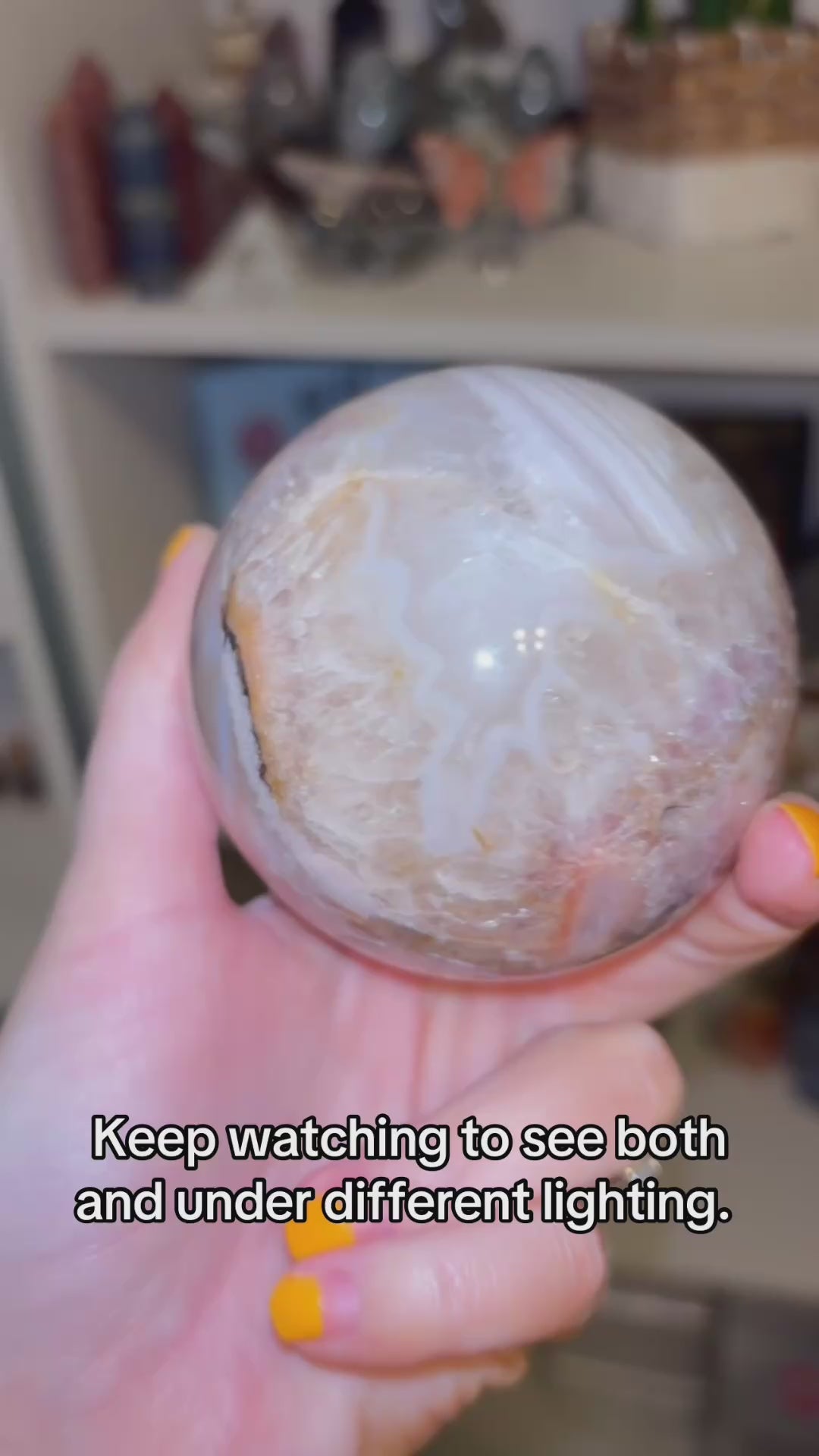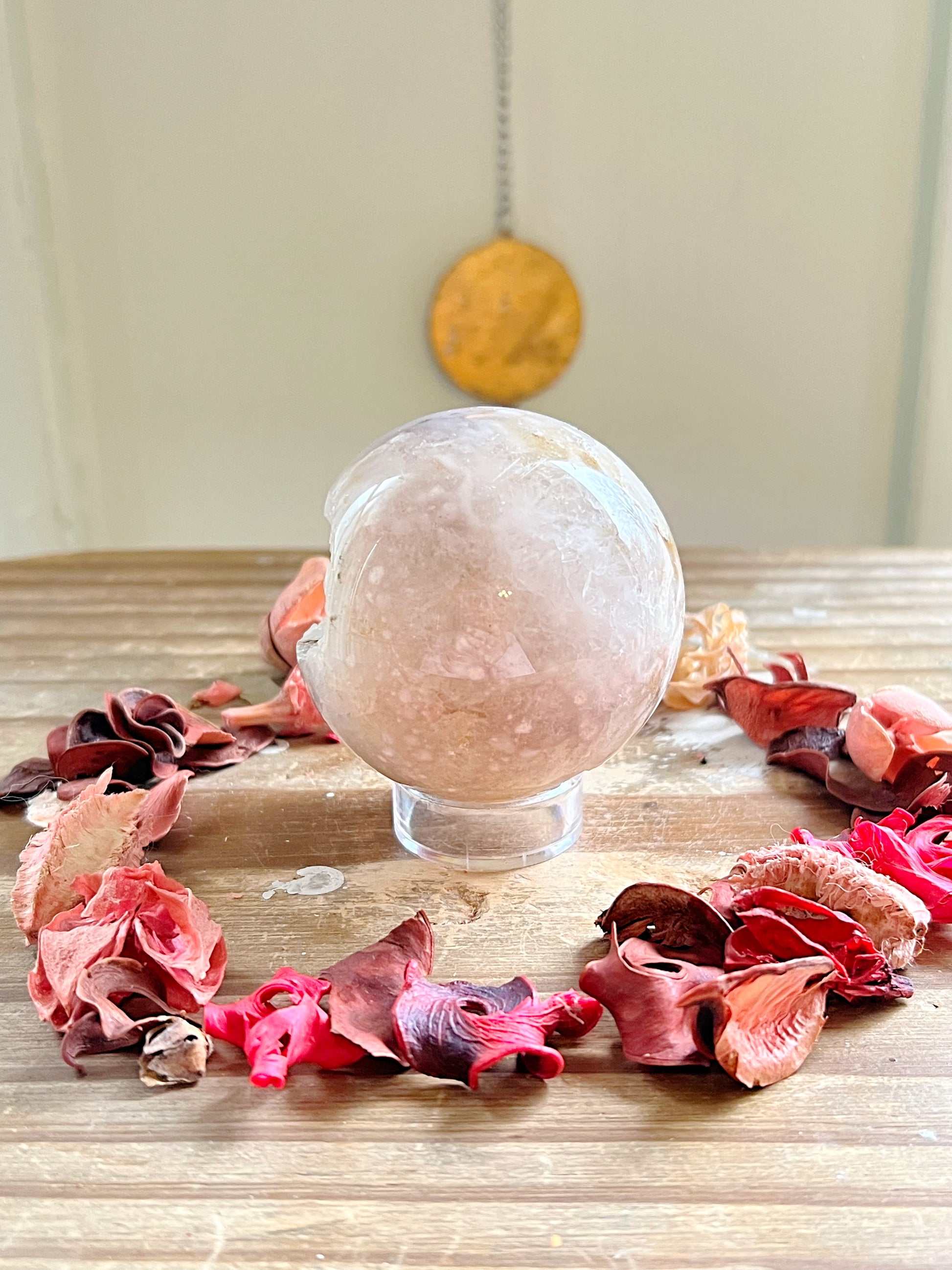 These gorgeous Flower Agate spheres have beautiful plumes with stunning detail and a mix of druzy on one and Amethyst on the other. Every purchase comes with a gift! Comes with an acrylic stand to display.
