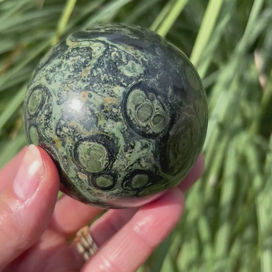 This stunning 1 lb Kambaba Jasper sphere has stunning green color and super cool patterns. Every purchase comes with a gift! Comes with a free acrylic stand.