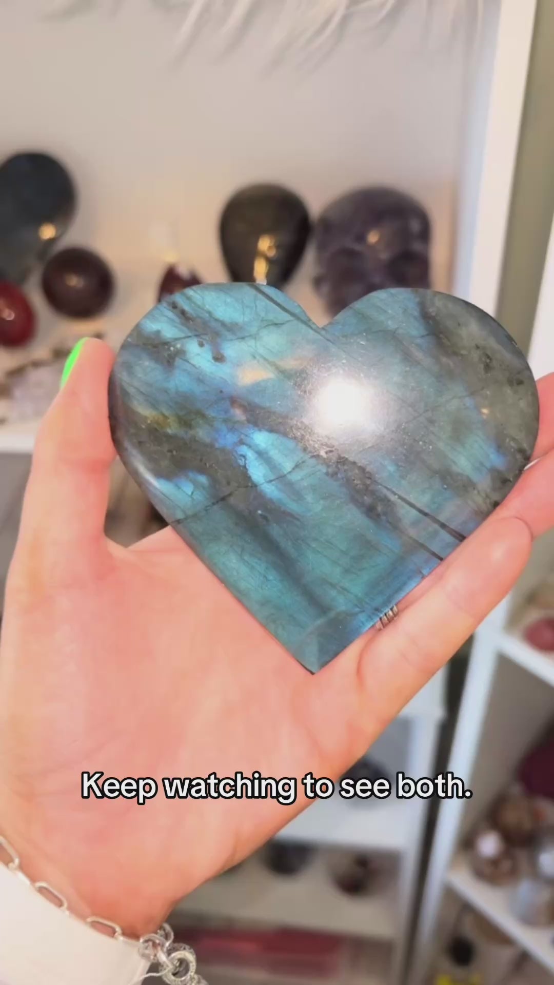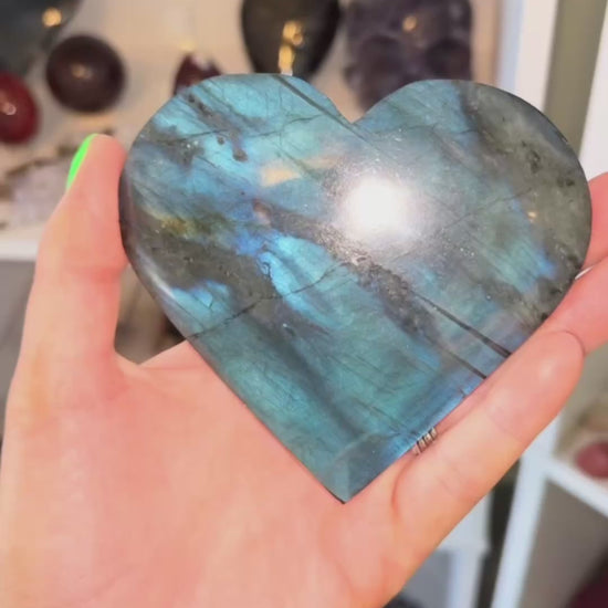 These gorgeous Labradorite hearts each have the most vibrant blue flash. They both come with stands. Every purchase comes with a gift!
