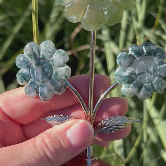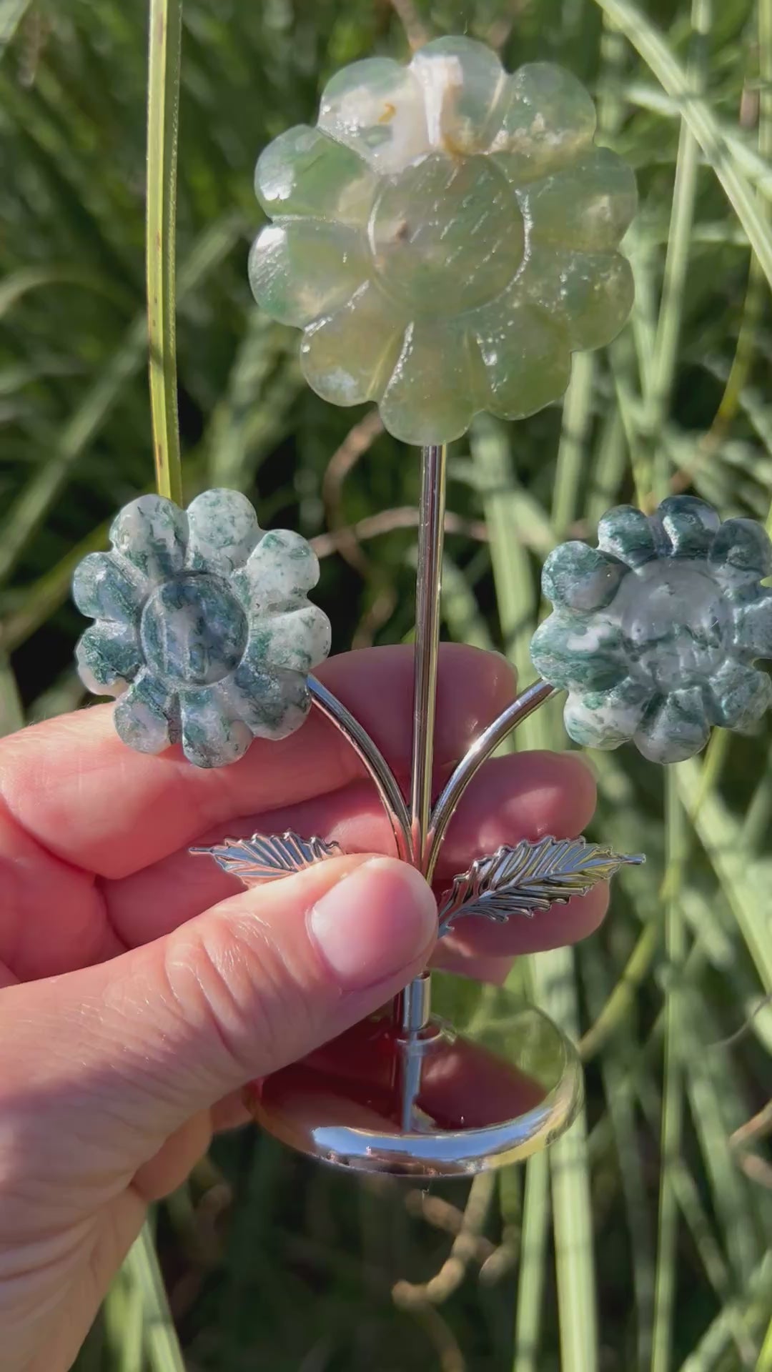 These gorgeous Moss Agate flowers come on a beautiful silver stand. Every purchase comes with a gift!