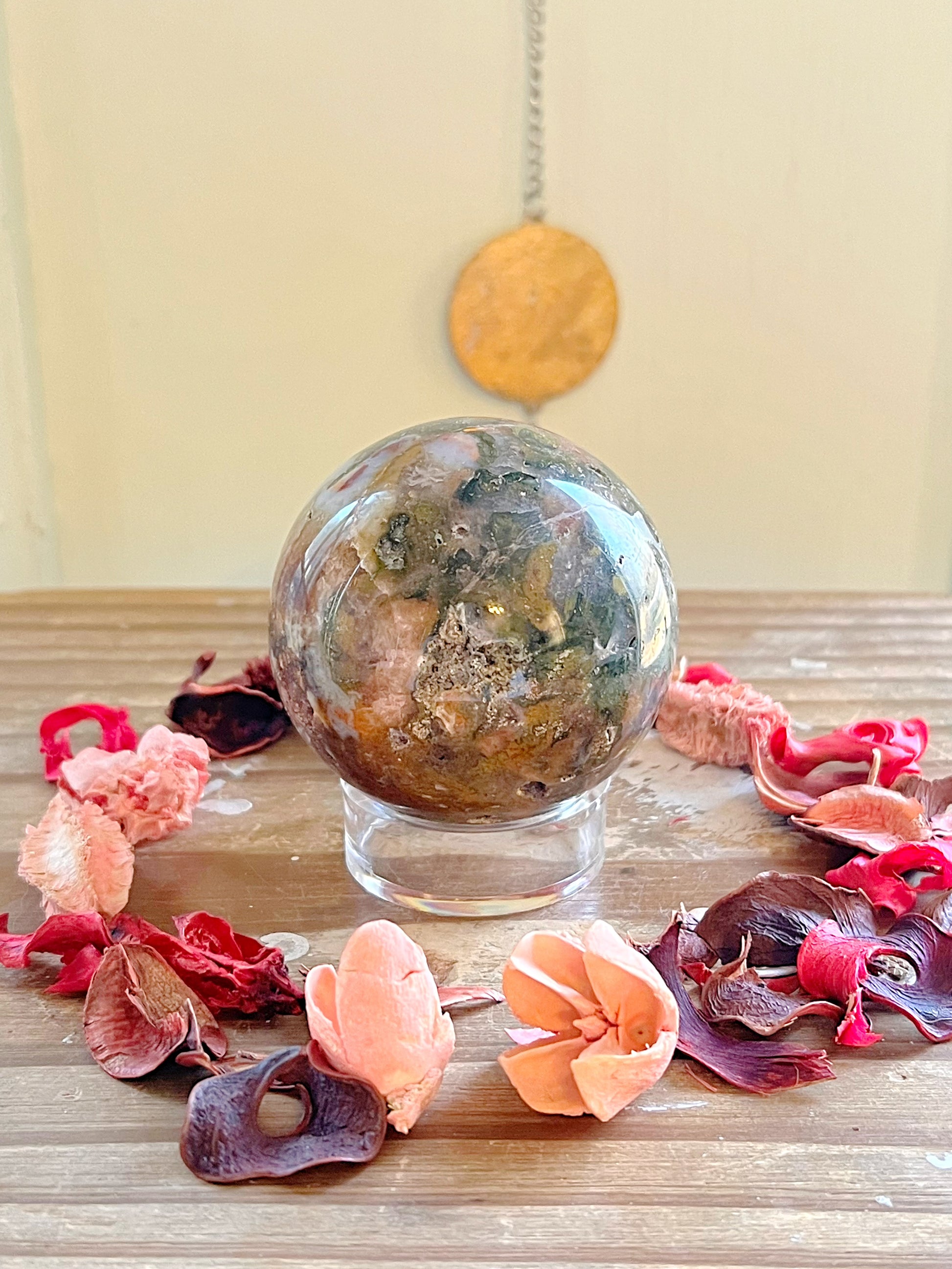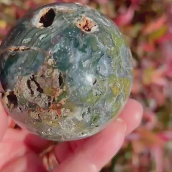 These gorgeous Ocean Jasper spheres each have a stunning array of color and patterns as well as super cool patterns and little caves. Every purchase comes with a gift! Comes with a free acrylic sphere stand.