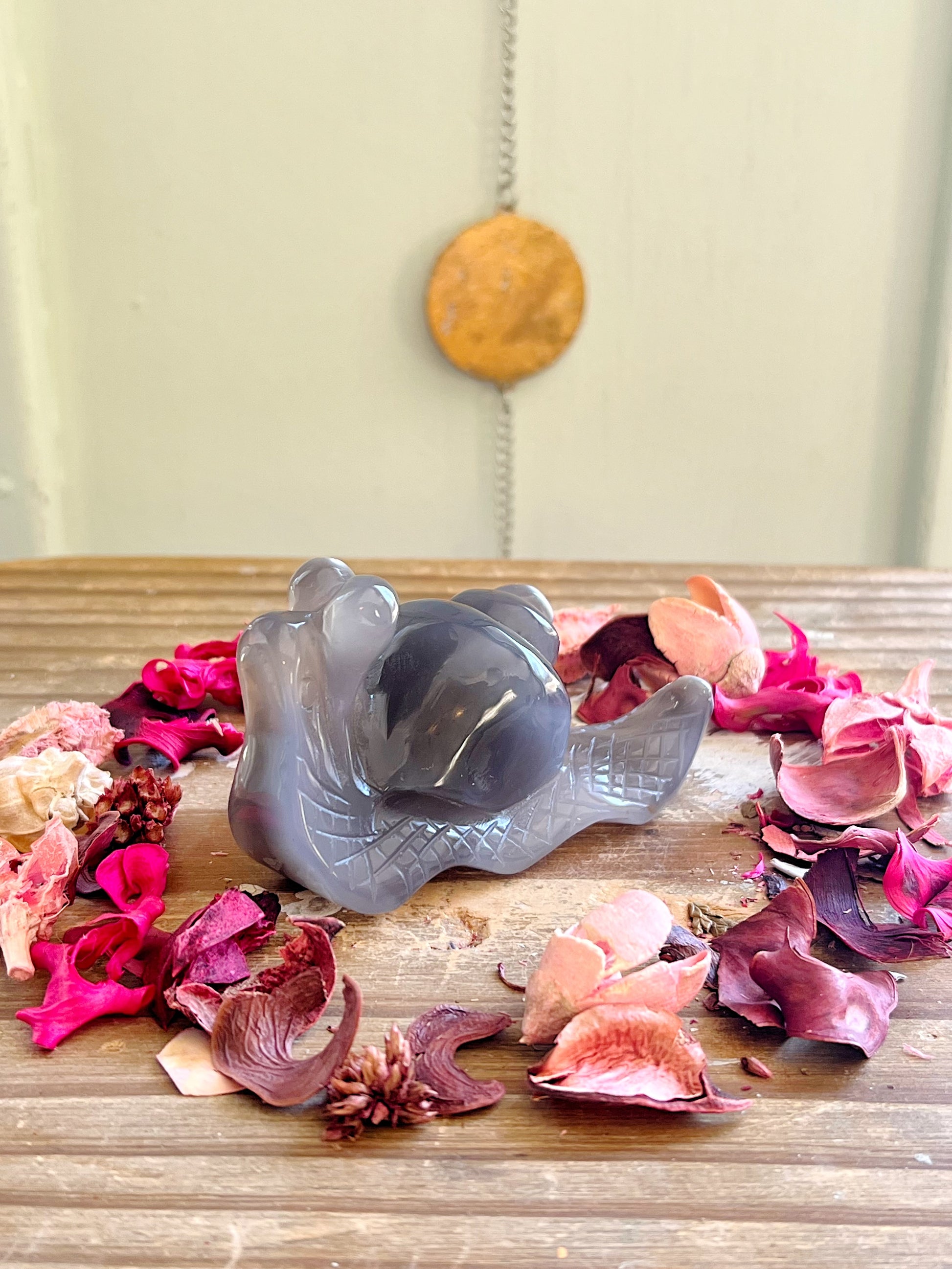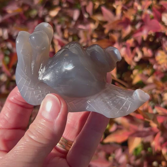 This precious Orca Agate snail carving has amazing detail carved within the stone as well as super deep Agate color and the cutest orca patterns. Every purchase comes with a gift!