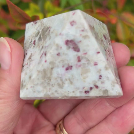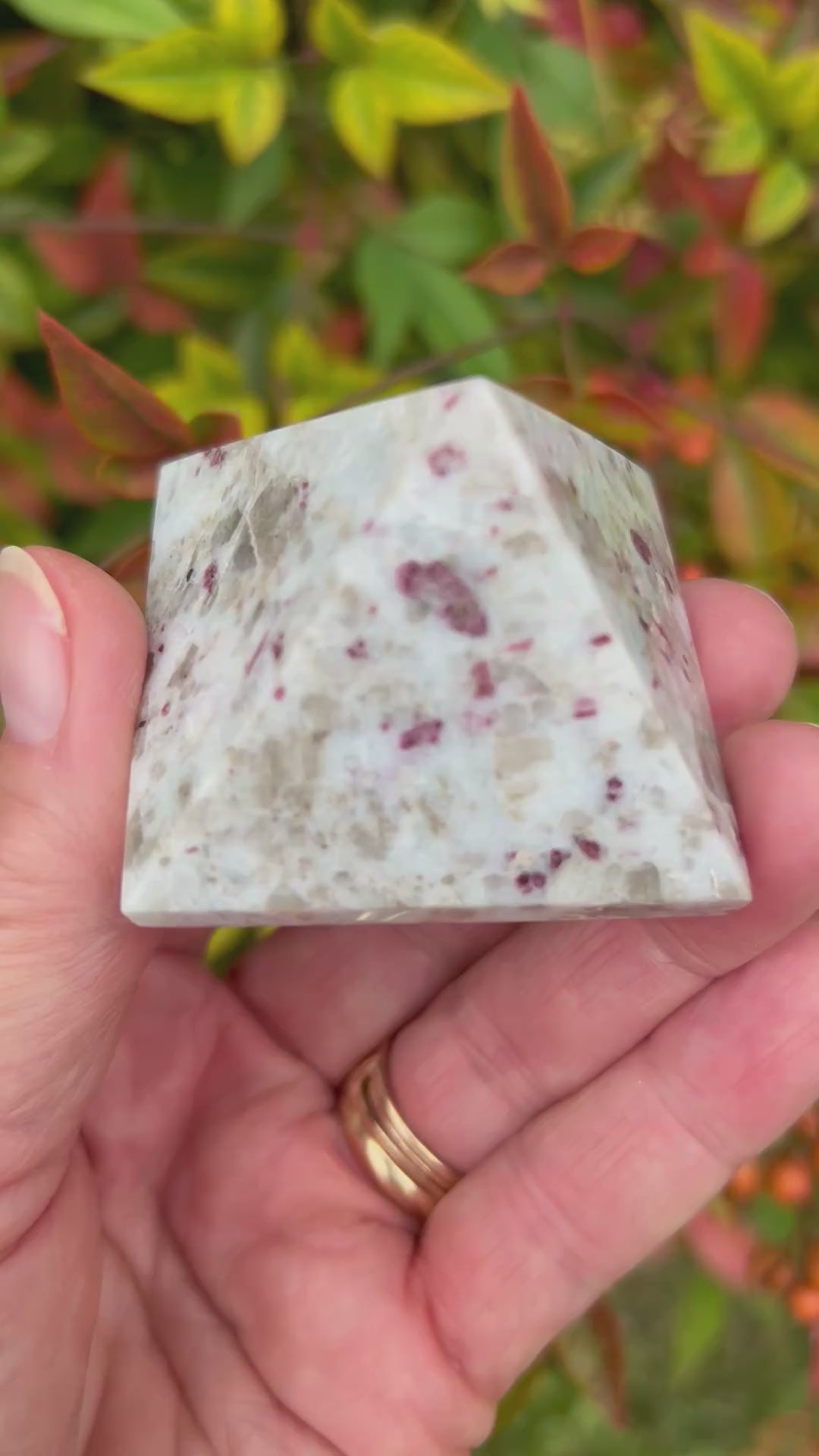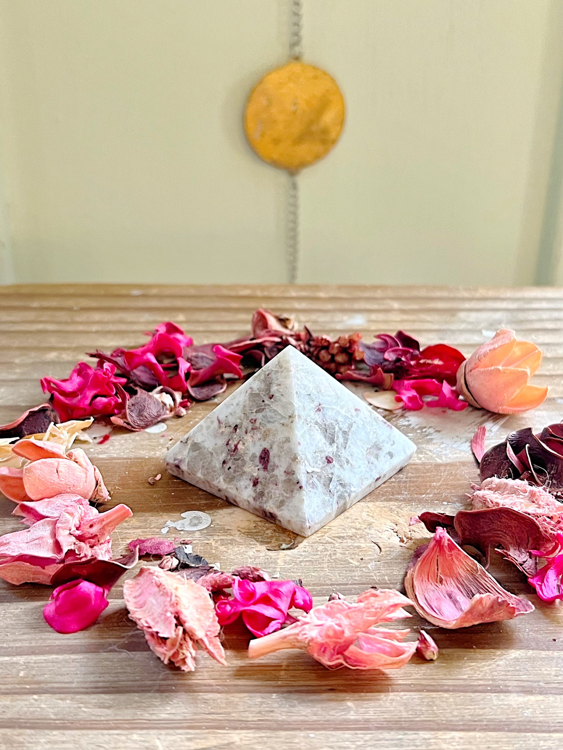This super cool Pink Tourmaline pyramid carving has the prettiest pattern with flecks of stunning pink. Every purchase comes with a gift!