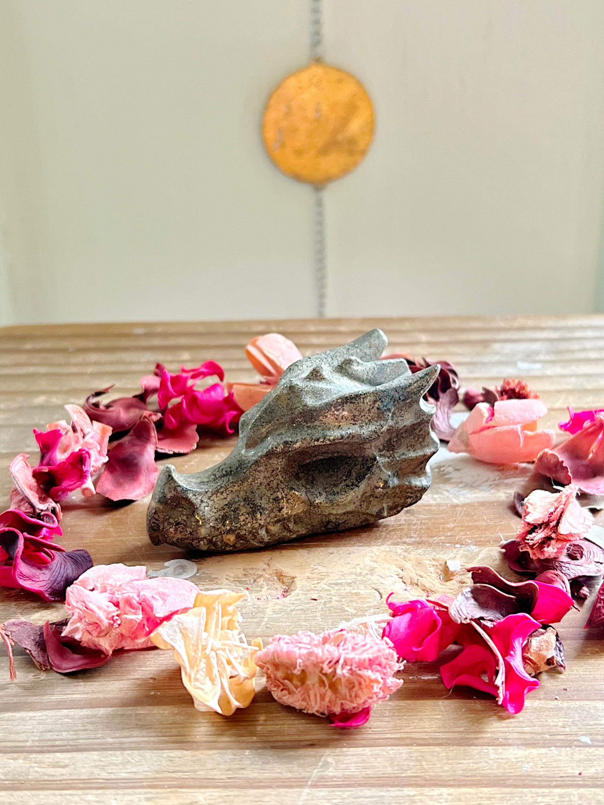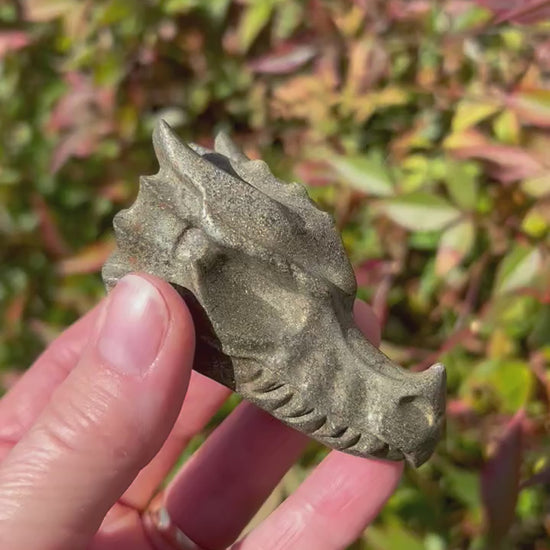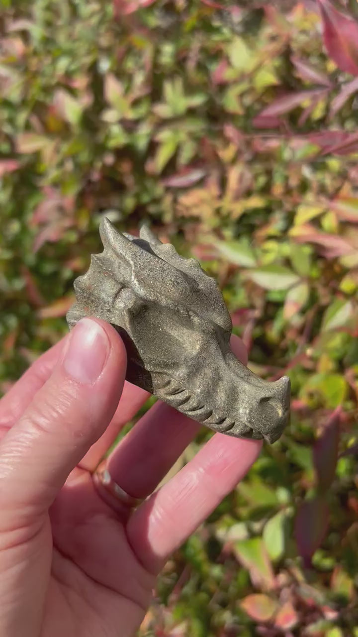 This incredible Pyrite dragon head carving is a stunning chunk of sparkly fools gold. It has great detail. Every purchase comes with a gift!