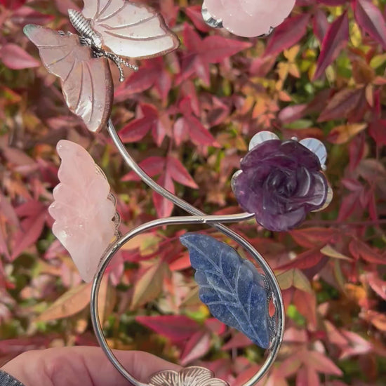 Rose Quartz, Ocean Jasper, Fluorite, Blue Aventurine Butterfly, Flower, and Leaf Carvings