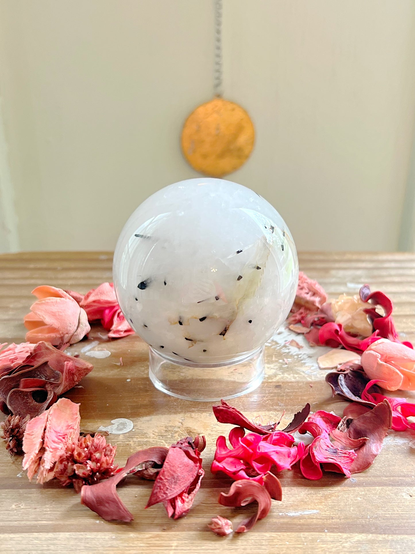 This beautiful Tourmaline in Quartz sphere has a stunning array of Black Tourmaline shards all in it. Quartz is the master healer and Black Tourmaline wards off negative energy. Every purchase comes with a gift! Comes with a free acrylic sphere stand.